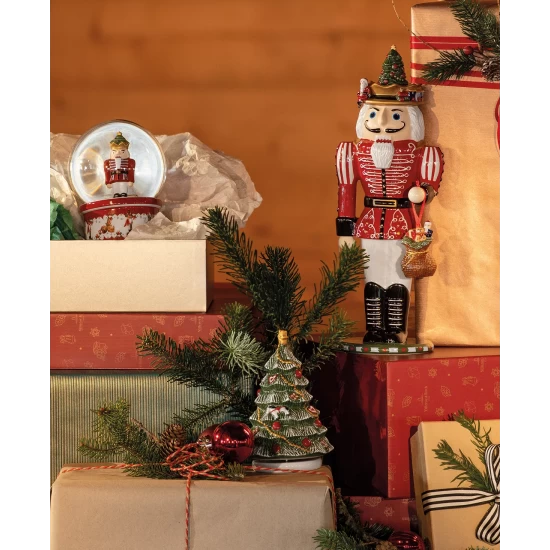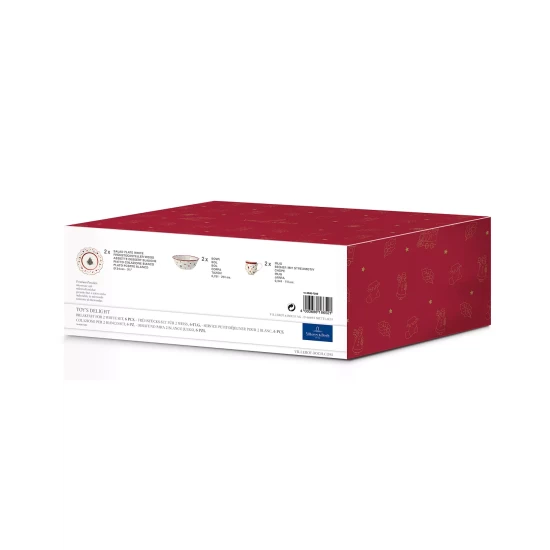 The Toy’s Delight 6 piece breakfast set includes 2 each Salad plate, all purpose bowl and mug. All have a scalloped design. The collection’s motif will evoke nostalgia for those young and old, featuring Christmas toys and trees, cookies, and other holiday treats in classic holiday hues, like green, red, and white. Dishwasher and microwave safe.